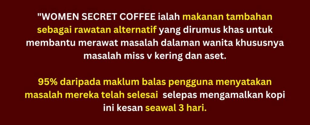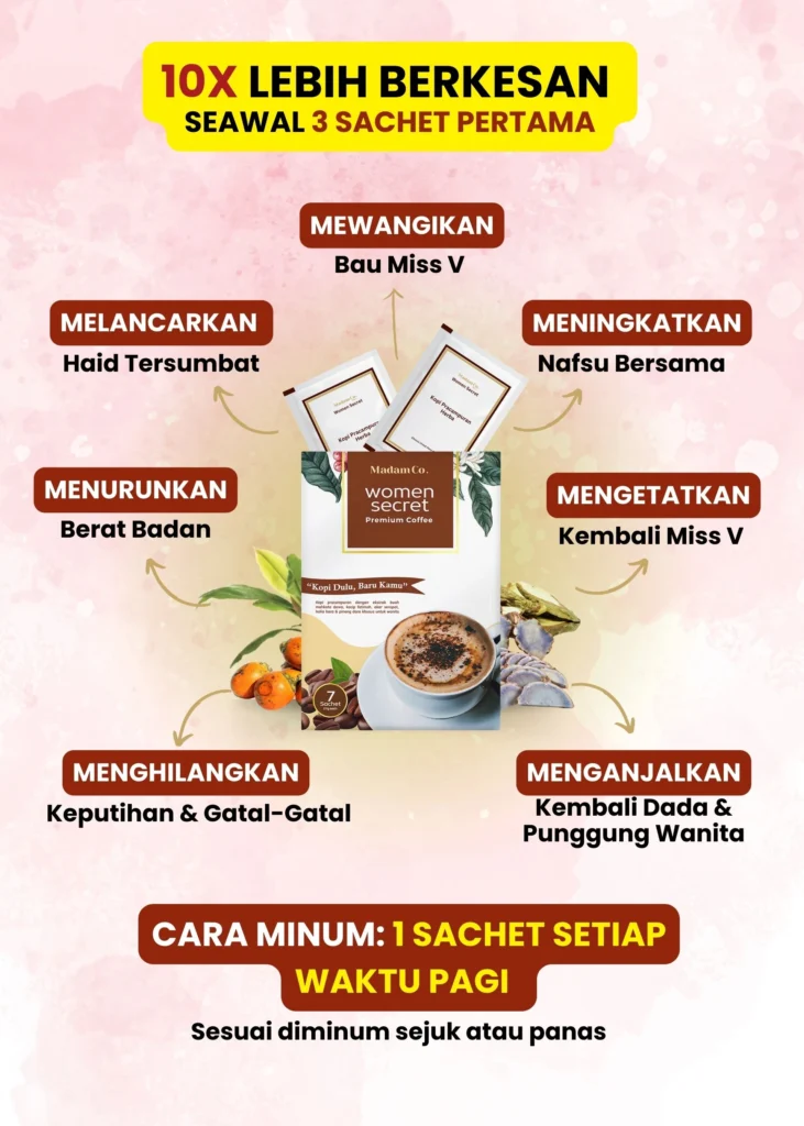 Women Secret Coffee diformulasikan daripada gabungan 24 herba premium, termasuk Akar Pajaka Dayak, Kunyit Hitam, Buah Mahkota Dewa, Buah Mengkudu, Keledek Batu, Kacip Fatimah, Akar Sekecut, Akar Serapat, Daun Mas Cotek, Daun Mimba, Daun Salam, Daun Belalai Gajah, Kulit Kayu Manis Ceylon, Getah Kayu Wangi, Temu Lawak, Temu Pauh, Temu Hitam, Halia Padi, Halia Bara, Pinang Dara, Serai Wangi, Biji Kani, dan Cengkih.