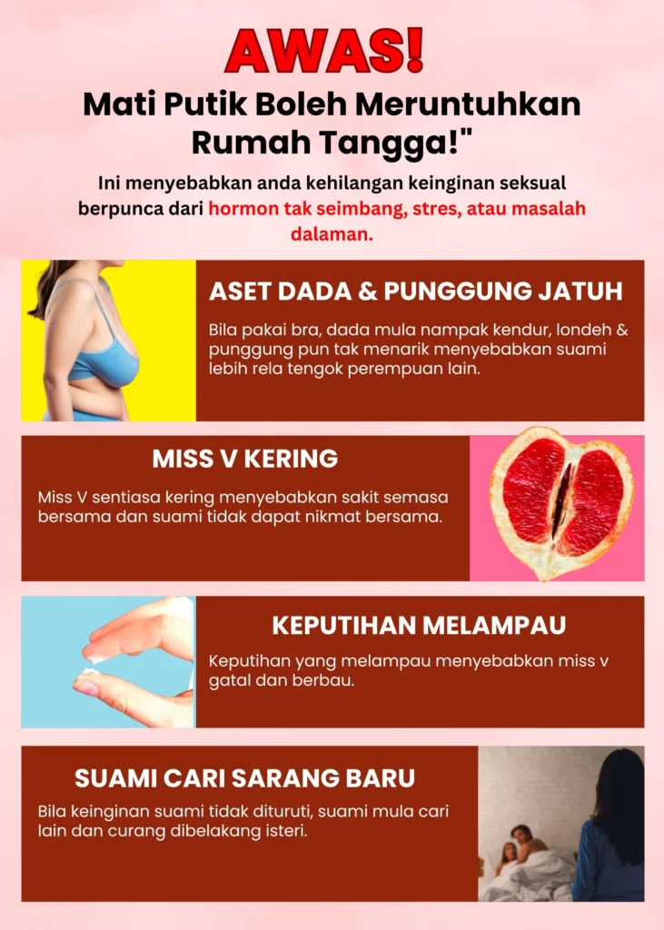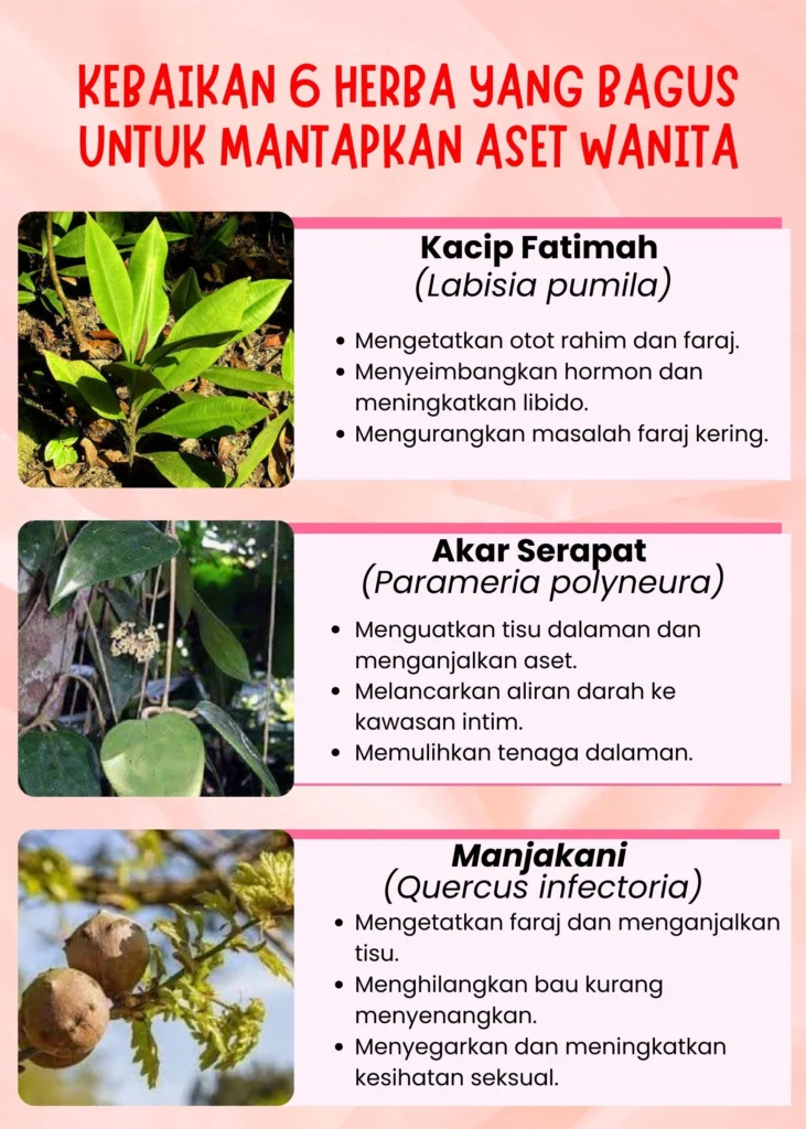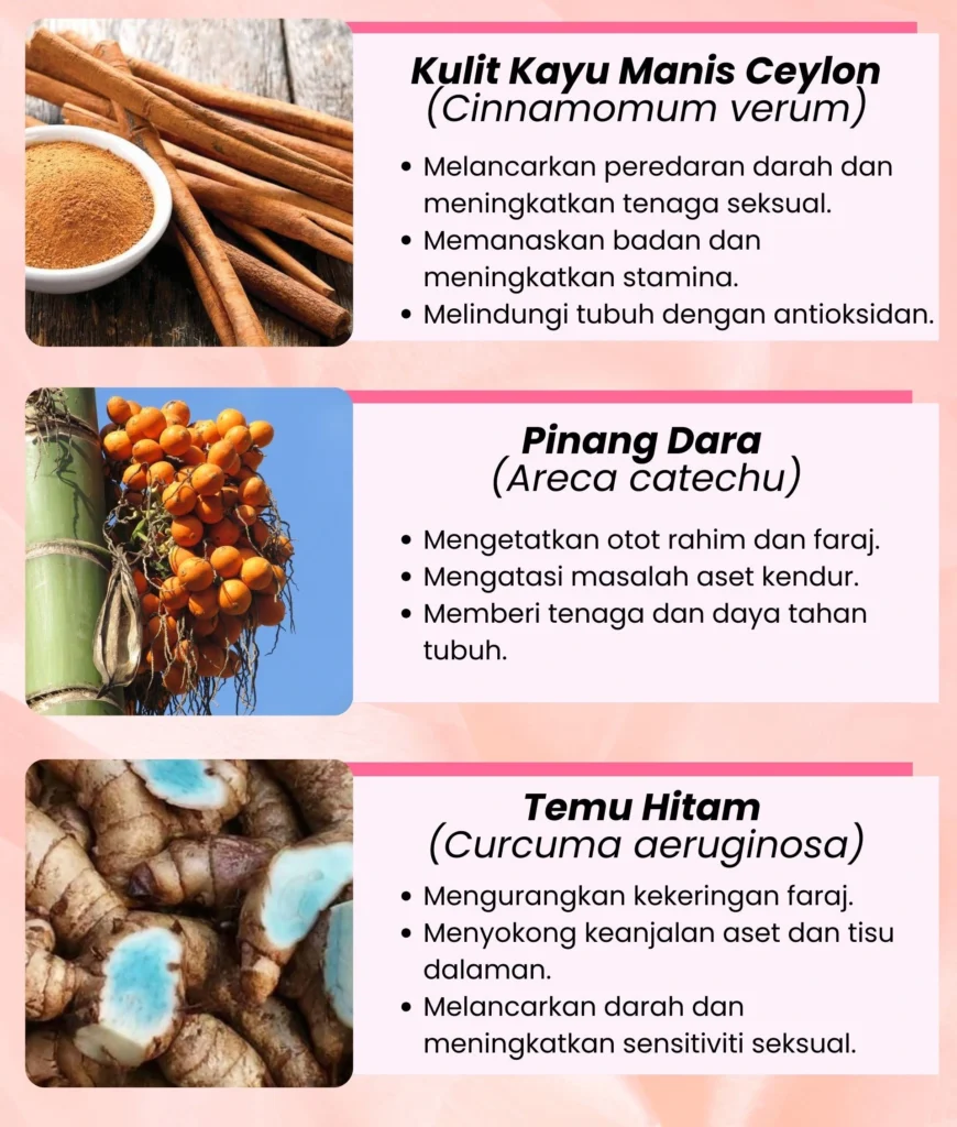 Setiap bahan ini kaya dengan manfaat tradisional yang membantu meningkatkan kesihatan dalaman wanita, menyokong keseimbangan hormon, dan memulihkan tenaga serta keyakinan diri.